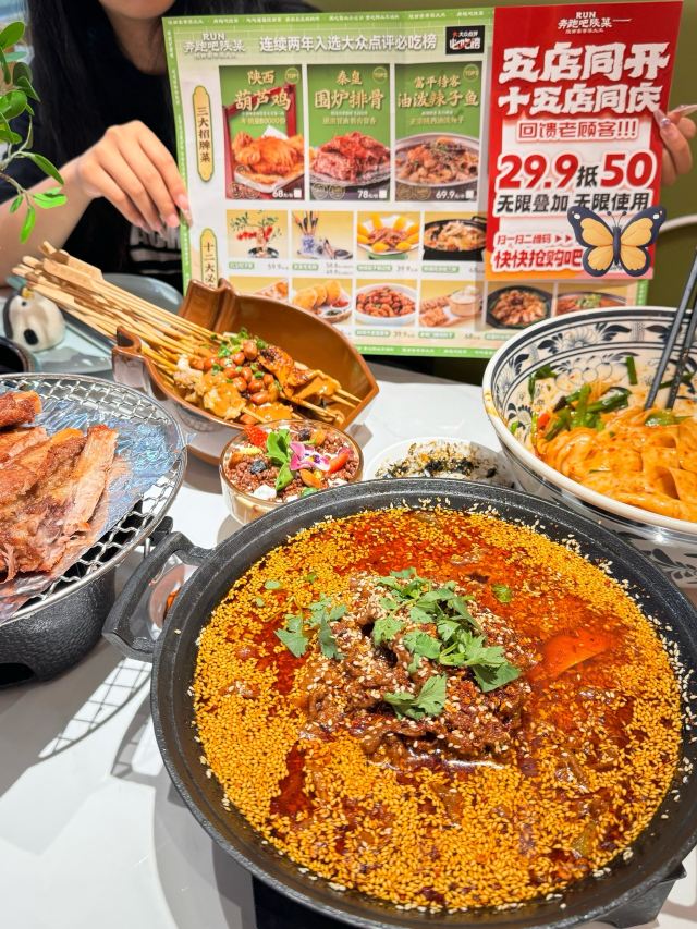 YoYo_2B2G1Q7A🍽美食推荐 奔跑吧陕菜(民乐园万达店):口味榜第一,服务榜第一,环境榜第一,人气榜第一,成为西安美食界的翘楚! 👉🏻推荐菜品: 🥩秦风大刀牛肉 选用的是优质的牛肉,经过精心的烹饪,口感醇厚。搭配特制的调料,每一口都能品尝到牛肉的醇香和陕菜的独特风味。 🐟富平待客油皮辣子鱼 这道鱼是奔跑吧陕菜的招牌之一。选用新鲜的鱼肉,搭配特制的辣子油和秘制调料,烹饪出的鱼肉鲜嫩滑爽,辣而不燥。 🍖秦皇围炉排骨 选用优质的猪排骨,经过特制的调料腌制后,再放入围炉中慢慢烤制。烤出的排骨外酥里嫩,香气四溢。围炉的烹饪方式更是让排骨充分吸收了火候的精华,味道更加浓郁。