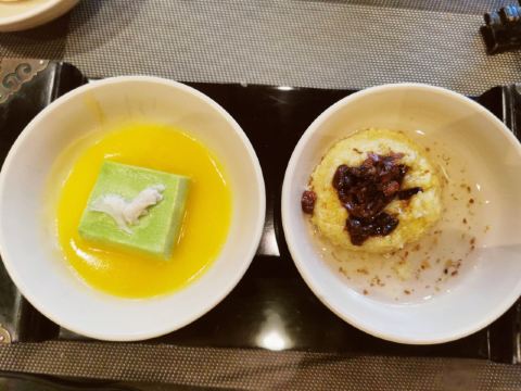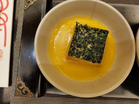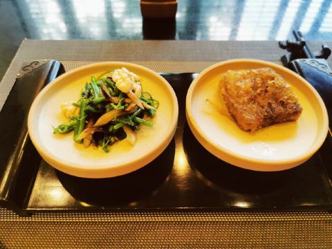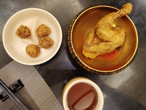 被这家餐厅惊艳到了,门口站着穿秦服的人已经引起了我们的注意,男同事们纷纷与之合影。我们被带到包间,内饰与排场让我们又一次惊叹了,然后更惊叹在后面,给客人都提供了秦服,女士红色,男士金色,男款有帽子,女生就没有,不过合影起来也挺好看。这样吃饭很有仪式感,就是时间一久有点热。菜是套餐,分餐制,一道道的上来,一开始还担心不够,结果,后面都吃不下了,脆皮猪肘很好吃外脆里嫩,葫芦鸡也很香,就是一人一只太多了,吃完这道后直接导致后面的胃口小了,有点可惜。