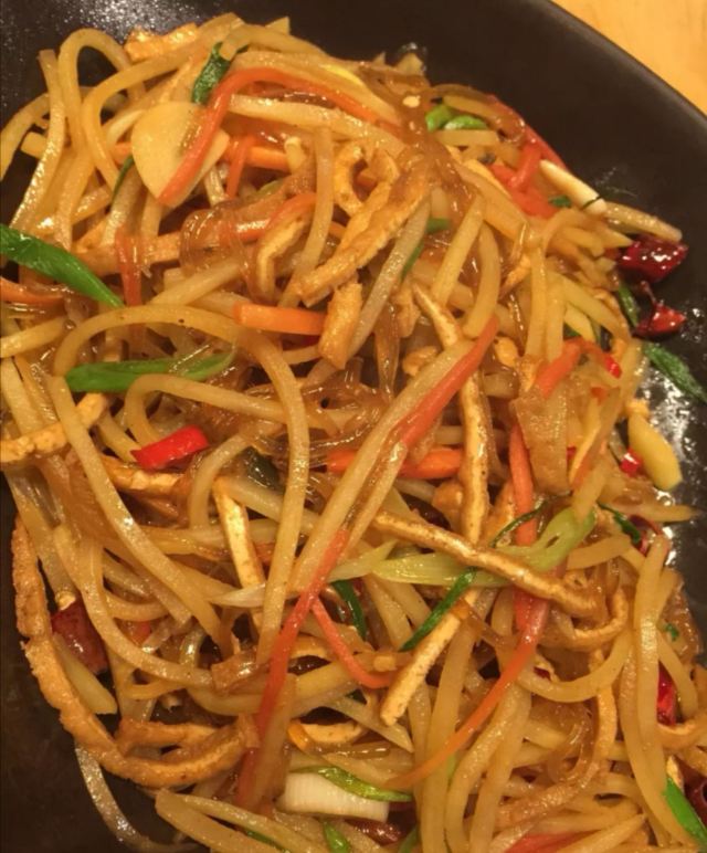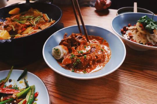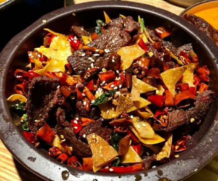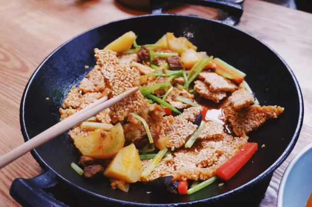 最让我惊艳的是「一个锅巴和时蔬」这道菜。它先上了一个完整的大锅巴,再用刀将锅巴戳碎,然后淋上满满的肉和菜,滋滋声冒着热气非常诱人。锅巴饱吸汤汁,酥中带软鲜香至极。 麻辣牛肉伴面皮和西红柿牛腩老哇撒也超吃,两者都很开胃。