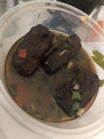 城里头十八总, 今天外卖点了湘潭的手工粉,他家还有大蒜炒腊肉,于是一起尝试了一下。腊肉分量还算是不错的,你饭给的很多有一大碗。我比较喜欢吃手工粉,虽然说商家也提前说明了会比较容易融成一坨,因为毕竟是外卖嘛,但是也不影响我对它的喜爱。腊肉要了特辣的,真的是特辣迟到差点怀疑人生,但是真的很喜欢哦。臭豆腐比较一般般吧。