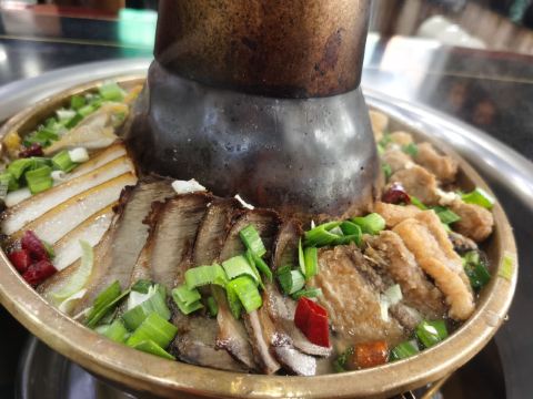 土火锅是青海风味的老字号火锅店,环境简陋,但是人气超火。土火锅采用烧炭火的铜制火锅,酸菜、粉条、带鱼、肉丸、腊肉、菌菇、豆腐等各种食材在羊汤里翻滚,荤素搭配,香辣爽口,份量十足。
