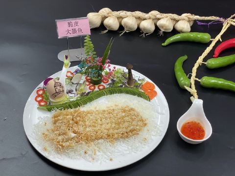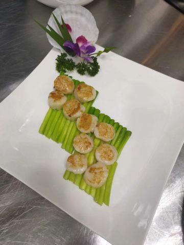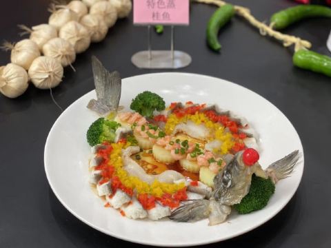 紫苏蒸山坑鱼,蘑菇包,蒜蓉油麦菜,脆皮叉烧,榄角炒米粉,山坑鱼,蟹黄豆腐,水煮牛肉