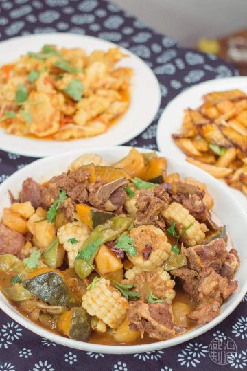 木耳肉馅饺子,韭菜盒子,锅包肉,酱骨架,荷塘小炒,酱牛肉