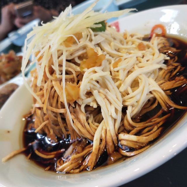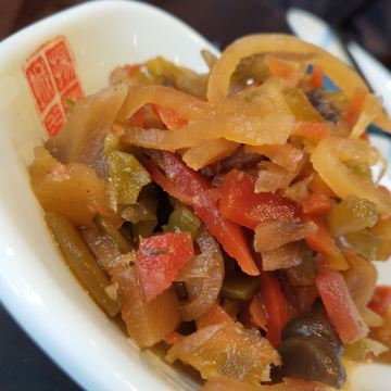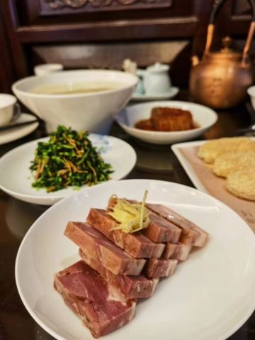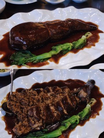 摆渡修行趣园茶社,瘦西湖边的淮扬菜,吃饭散步都惬意。 ☻肴肉 辣椒配醋蘸着吃,一家子都好这口。 ☻文思豆腐 很考验刀功的一道菜。豆腐丝极细但不够长,说明厨师刀功还有待提高。至于味道,我从小到大就没觉得好吃过。想让豆腐丝如此飘然,勾芡是必然,勾芡过头太厚重不好喝也是必然,这家虽然是藕粉勾芡,但是也没什么特别。 ☻蟹粉狮子头 肥瘦相间,鲜香软嫩,吃一整个也不会腻,汤都要喝精光。 ☻蟹黄豆腐 金灿灿的一盆,我以为会咸香浓郁,但是没有,蟹香几乎为零,味道非常淡。 ☻八宝葫芦鸭 趣园的招牌菜。在保持鸭皮不破的情况下将整只鸭脱骨,再塞满八宝糯米饭和鸭肉,然后扎成葫芦状。 切开以后,肉香糯米香四溢,糯米里加入了百合松子红枣等,越吃越香。 ☻黄豆闷脚圈 黄豆和猪脚都炖的色泽诱人软烂入味,猪脚肥嘟嘟,用筷子就可以轻松拆开,黏糯酱香回味无穷。 ☻淮扬软兜 鳝丝的分量有点少,但是鲜滑的同时脆嫩得刚刚好,很合我胃口。 ☻煎锅贴 午市的点心选择很少,随便点了锅贴结果远超预期!锅贴煎得金黄酥脆,肉汁鲜美且饱满,一咬给我喷出来。 ☻翡翠烧麦 烧麦真的很可以! 面皮薄透,荠菜馅油润碧绿,超级香。妈妈都赞不绝口又加了一屉。