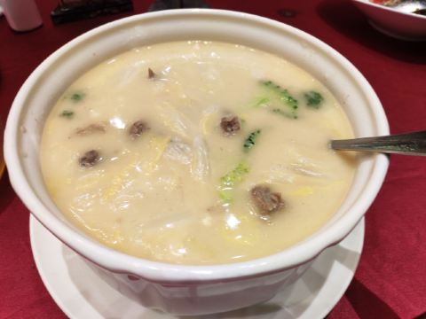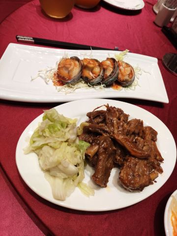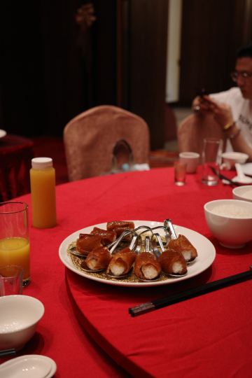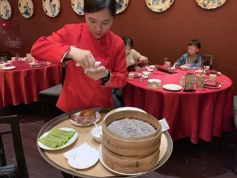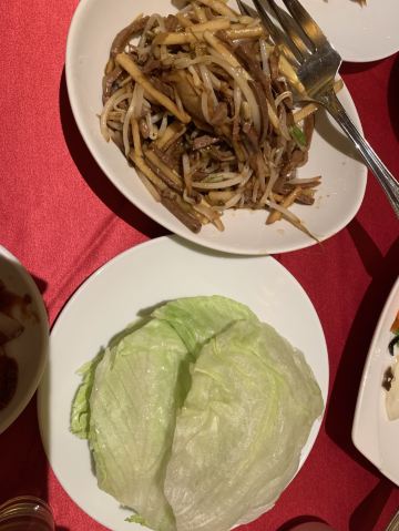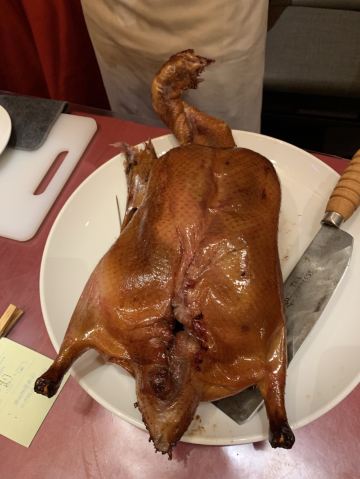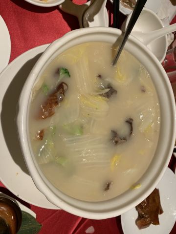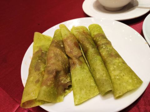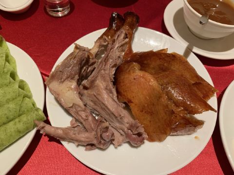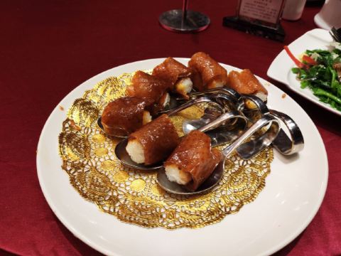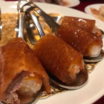 樱桃霸王鴨(一鴨五吃),真的太美味了。 第一道是香滷鴨小拼,鸭掌及鸭翅滷的很夠味。 第二道是鴨皮握壽司,香脆的鴨皮包著起司及米飯,一口吃下,瞬间鴨油充满口中,越嚼越香。 第三道是片皮鴨捲三星葱餅(有兩種:綠色薄.皮和厚的葱油餅皮),配上特制醬料,美味。 第四道夏之樱,是鴨肉絲配新鮮生菜,再淋上特調醬汁,意外好吃。 最後一道是白菜煲鴨湯,用鴨架熬煮成白色湯頭,香味濃郁,喝起来唇齒留香又不會太腻,連喝好几碗啊。 特别建議點套餐,份量足又划算