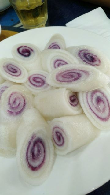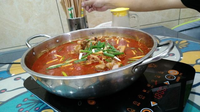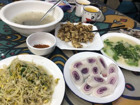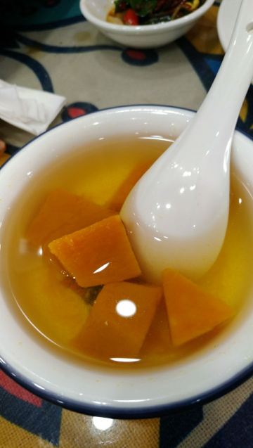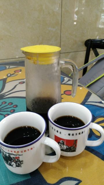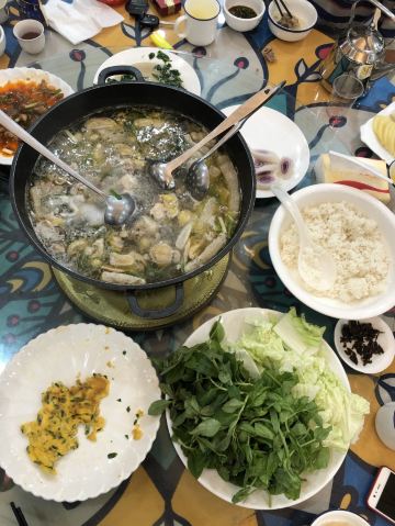 在黄果树游客服务中心有一条街都是饭馆,好几家都是有团购的,这次有点饿,选择个人数多的套餐吧。两个人团了一个3-4人猪蹄火锅餐,确实挺撑的。酸梅汤超级好喝,酸酸甜甜的,浓郁香醇。青菜拼盘里的绿色的菜也灰常好吃,人参菜,当地的一种野菜,口感像木耳菜,滑溜溜的。苋菜平时也很少吃,味道也挺新鲜。