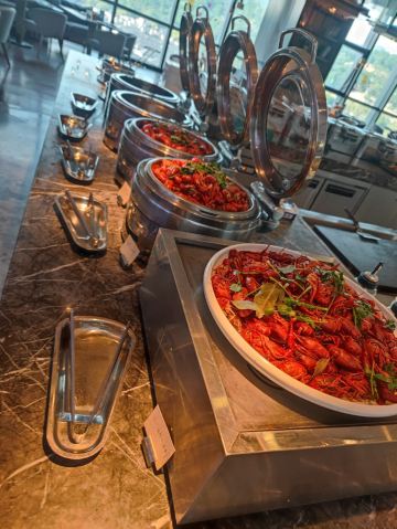 品种齐全,小火锅,烧烤煎扒,刺身,捞汁小海鲜,炒菜,啤酒畅饮,小龙虾一应俱全。住店优惠大,性价比很高。
