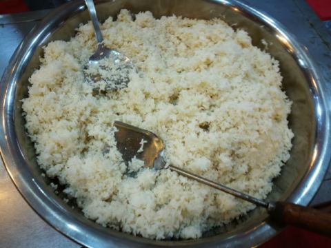 炸香蕉,南瓜粥,素斋排队处,素斋入口,素斋饭,油豆腐,木耳,白菜豆腐,黄芽菜,素斋券,土豆丝,菜饭,茄子,菩萨饭,素斋