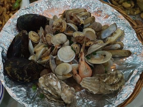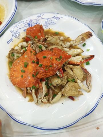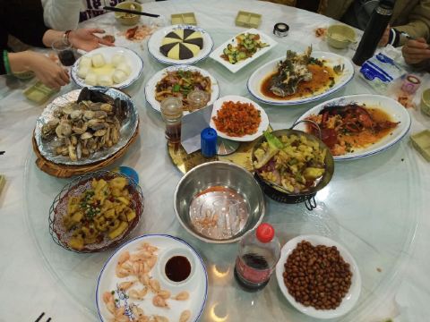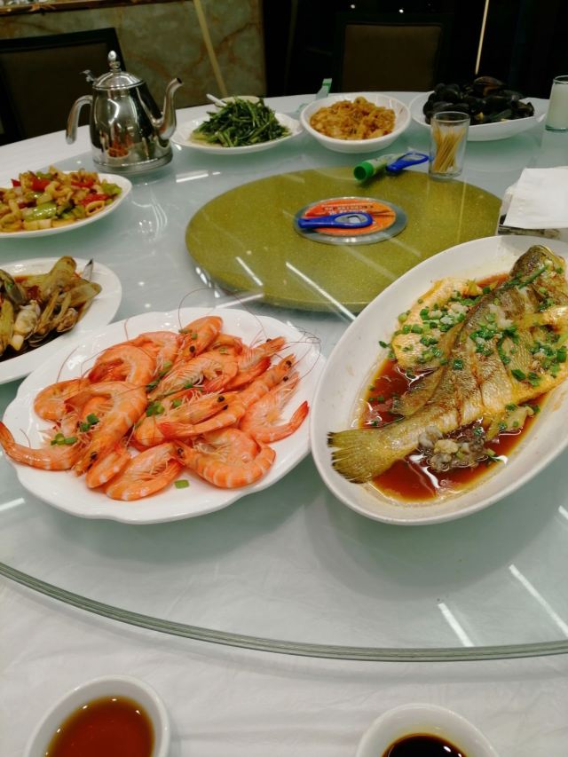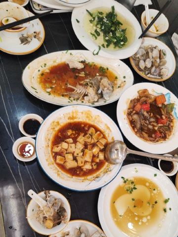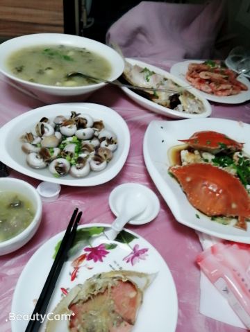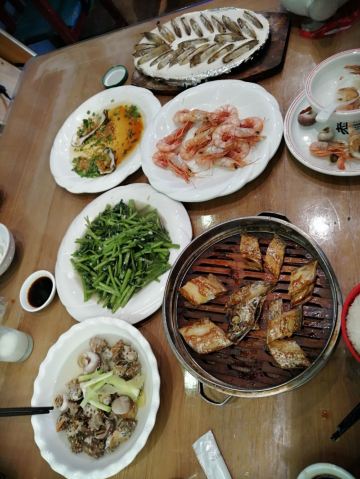 晚上,恰遇大雨侵袭,幸好我们自驾,跟着导航从酒店来到餐厅,天呢,下如此大雨的恶劣天气,却难敌顾客的热情,里里外外,几无虚席,运气不错,里间还有大圆桌刚翻台。 路边划线的停车位有限,且早已停满,我们就开进餐厅边上自备的停车场,长三角一带的汽车牌照皆可在此见到,由于场地有限,就餐顾客的车辆遵循先来的停里面,后到的堵外面,吃完,离场的时候,让餐厅小哥通知后到堵车的顾客挪车即可,大家互相理解喽! 来海边,当然要吃海鲜,何况禁渔刚结束,就要了158元一斤的梭子蟹,挑了2个,称重1斤8两,葱油做法,以及68元的葱油海瓜子一份,我开车不喝酒,喝点饮料,而给同行的要了当地的紫竹林啤酒,解解馋。 餐厅有包厢,堂食区域划分好几个区,室外也有露台位,装修很普通,环境甚至可以说略零乱,毕竟顾客太多了,但纵是如此,服务员还是忙而不乱,态度热情,出菜速度快。 番茄炒蛋、香菇青菜和紫菜虾皮汤都是常规的家常菜,味道中规中矩。 海虾白煮、葱油海瓜子、葱油梭子蟹都采用了最常见也是较能保留海鲜鲜味的做法,实在的口感妥妥出自新鲜的品质。