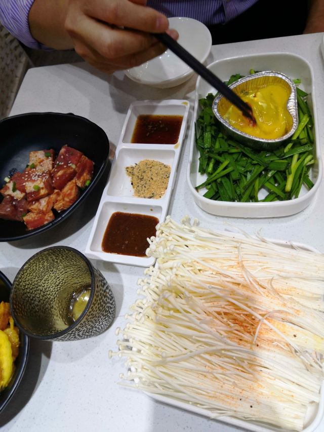烤肉味道不错,价格实惠,主要是韩式风味烤肉,蘸料有很多选择,没有感觉到的那么火辣辣的,老板很实在,推荐的菜品干净卫生量还多