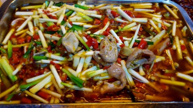 味道阔以,爆炒黄喉不错,很脆!但是爆炒兔肚有些像肥肠,咬不动,兔肚很脆!总得来说黄喉最好吃!爆炒肥肠一般,双椒牛蛙还阔以