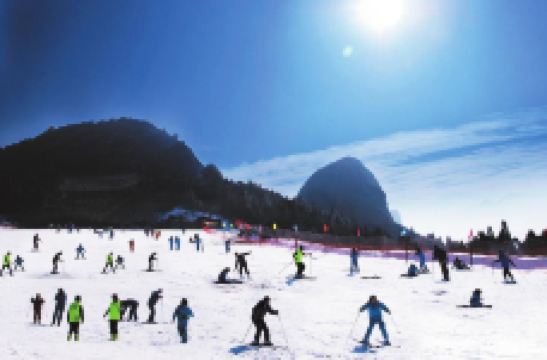 雪道占地1万平米,长度200米,落差60余米,平均坡度为7°,可同时容纳300-500人滑雪,适合儿童和初学游客滑雪娱乐,也能满足滑雪技术上乘游客的需求。滑雪场内还有一条长200米的雪圈道路,环绕雪圈道路可沿途观赏石姆岩、寿星岩、金钟岩以及大高石,大高石垂直高度达260余米,被称为“丹霞高石”,蔚为壮观,其形如柱,突兀峥嵘,体大壮观。