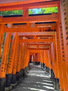 走进千本鸟居,老朽褪色的暗红色牌坊和光鲜亮丽的朱红色牌坊密集地交织在一起,透过阳光的照射显得格外壮观迷人,视觉上相当震撼,吸引了许多喜爱摄影的朋友。沿途的鸟居是由个人或公司捐献的,在每个鸟居的背面可以看到捐赠者的姓名和捐赠的日期。
