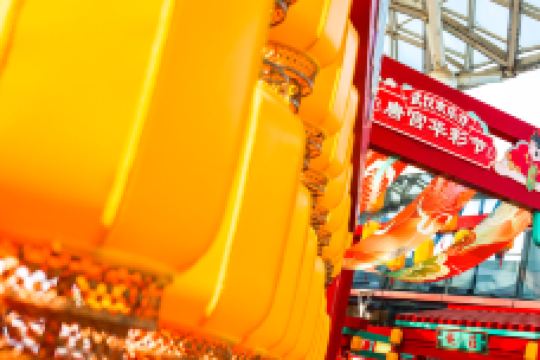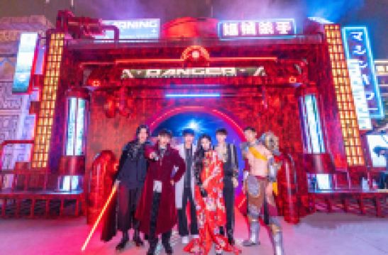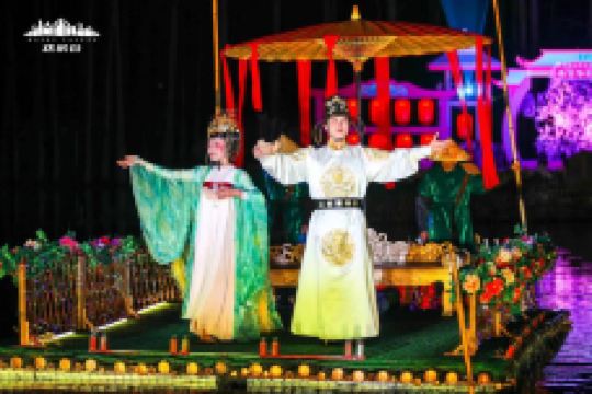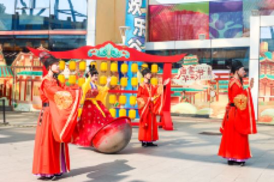 欢乐江城主题区以荆楚地域人文为背景,以多彩诙谐的语风串联出一幅幅欢欣鼓舞的侠义场面,生动地再现了湖北地区的文化风情,规划了水寨集市、水岸江城两大版块,景观丰富。