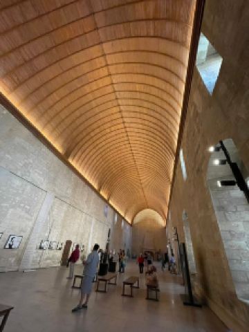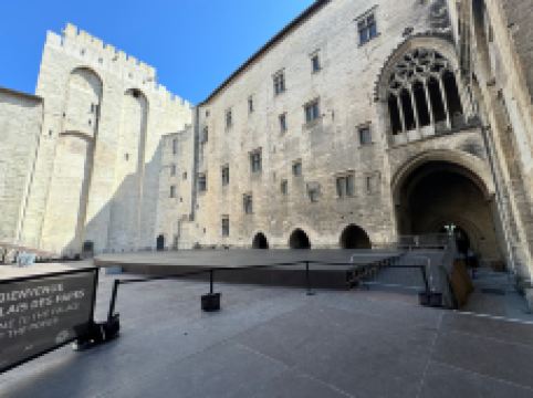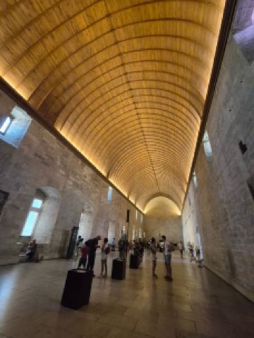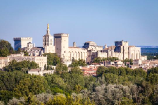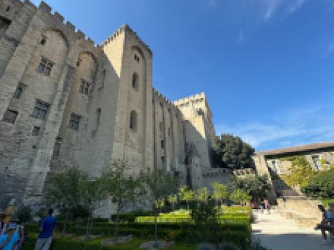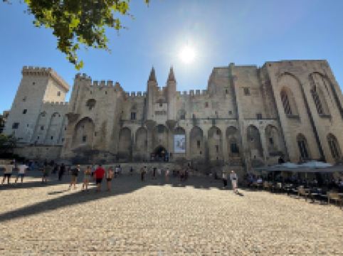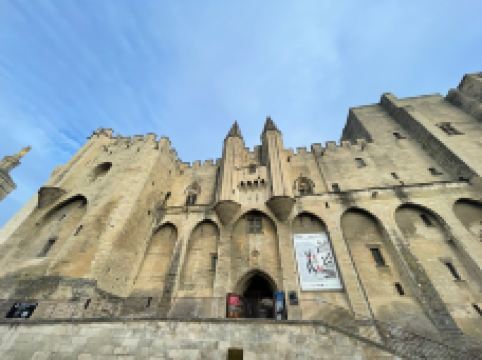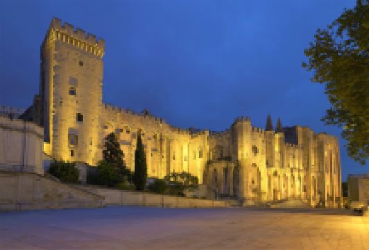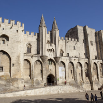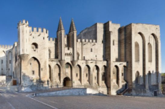 教皇宫坐落在阿维尼翁的罗纳河畔,是欧洲规模较大的中世纪哥特式建筑,正是因为它的存在使阿维尼翁成为了一座教都。它是一座结合了宫殿与军事要塞为一体的建筑,矗立在古城的高处。教皇宫分旧殿和新殿两部分,旧殿朴实无华,属罗马建筑风格;新殿富丽堂皇,为典型的哥特式建筑。建筑外侧以宏伟的城楼为防御,并以重兵驻守,10座塔楼雄据宫殿四周。之前宫殿内部的圣像和摆设几乎完全被摧毁、洗劫一空,如今从宽阔、挑高的会议厅与教皇卧室上方精雕细琢的天花板,依稀可以想见辉煌时期的模样。登教皇宫的高点,可以看到整个古城全貌。