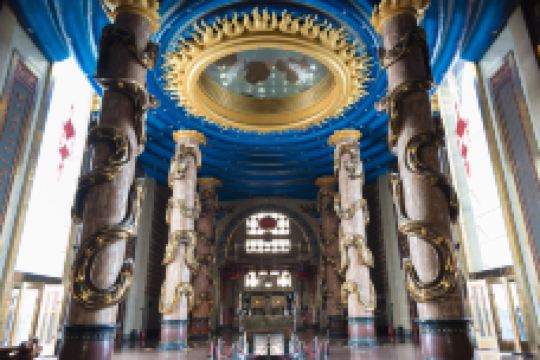 临汾市尧都区的华门,是一座华夏文明纪念碑。山西南部是中华民族古老的发祥地,可以说,中华民族的文明之门就是由尧舜开启的,而它就是为纪念帝尧统一华夏、开启文明之功、展现中华民族历史渊源远而建设的。当地人认为,这里代表和体现的是中国久远的历史文化,堪称文化上的“天下第一门”。它由基座、主门及门楼三部分构成,主体工程包括大台阶、裙房、主门、阁楼4部分,地下二层,地上7层,总高50米。正面三门矗立,象征尧、舜、禹三帝。主门高达18米,是世界上较高大的门,主门以刚刚开启的形式,象征尧帝开启中华文明之门。景区内部以丰富的文化内涵展示了华夏文明和民族文化。主门正前方长达25米的瀑布墙,代表着孕育中华民族的母亲河——黄河之水高悬而下,华夏文明由此源远流长;中间自上而下依次排列的21个彩球,代表着尧舜之后夏、商、周、秦、汉等21个历史朝代,生动地展现着中华5000年文明从尧舜开始源远流长的历史进程;进入所经过的56级黄褐色的台阶则代表着56个民族,寓意中华文明由各民族历经5000年共同创造。景区中的华门-尧天舜日,由位于顶部门中央的巨型水晶太阳和周围8个火焰星球构成“九日同辉”,九道蓝色光环围绕太阳递次向外扩伸构成“九重天体”,南北两道拱型灯饰犹如两道彩虹,百余盏顶灯与太阳天体相互映衬,给人以动变深邃、宽远无限之感,这是根据尧舜时期“羿射九日”的传说和人类先祖对“九重天”的古朴认识而设计的。华门龙柱高达14米,为青铜铸造,是目前中国最高的龙柱,其塑造了中国古老的立体龙形,无角无爪,简洁质朴,蕴含着一切变化的生机,龙体不是四足支撑盘绕石柱,而是腾悬飘浮,呼之欲动。