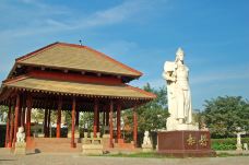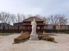 妇好墓即殷墟五号墓,位于殷墟宫殿宗庙遗址附近,是殷墟科学发掘以来发现的保存完整的商代王室成员墓葬。该墓是一竖穴墓,基口长5.6米、宽4米、深约8米,面积不大,仅为20多平方米,但随葬品极为丰富,共出土青铜器、玉器、宝石器、象牙器等不同质地的文物1928件,墓上建有被甲骨卜辞称为“母辛宗”的享堂。根据该墓的地层关系及大部分青铜器上的“妇好”铭文,考古学者认定墓主人为商王武丁的配偶——妇好。现位于妇好享堂前的汉白玉雕像是根据有关资料塑造的妇好形象,披坚执锐、目光炯炯,手持龙纹大铜钺,重8.5公斤,不愧为中国早的女将军,英姿飒爽、威风凛凛。而另一件虎纹铜钺重达9公斤,可见她武艺超群。在古代钺曾是王权的象征,这也说明妇好在殷商时期地位之高,很受尊敬。