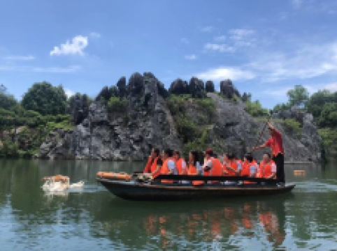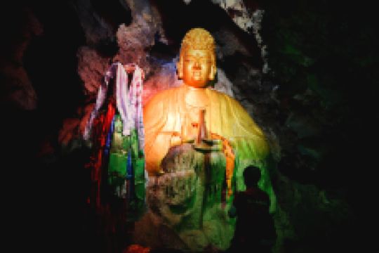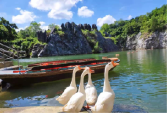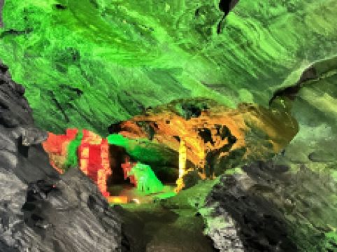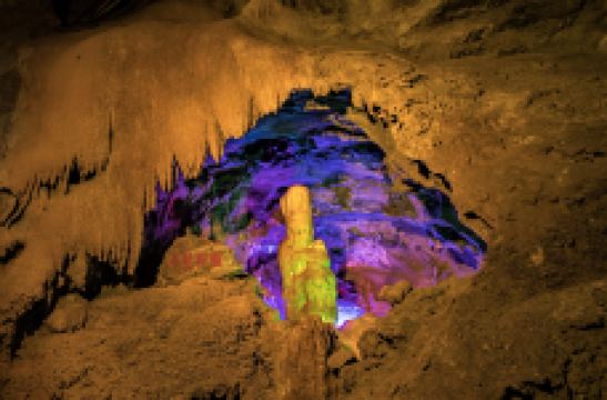 石花水洞并不是很大,却集众多溶洞的特点于一身,洞内有石笋、石柱、石瀑等景观,在景观灯的照耀下显得绚丽斑斓,尤其是洞内发育生长的“一石二花”——卷曲石、文石花和方解石晶体花,这都是非常珍贵的溶洞景观。乘船游于曲折蜿蜒的地下暗河之上,宛若遨游龙宫,让人浮想联翩。