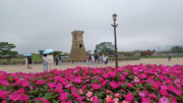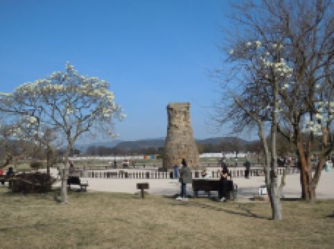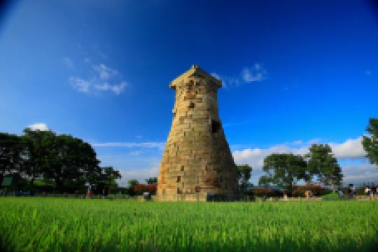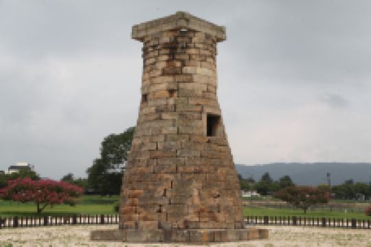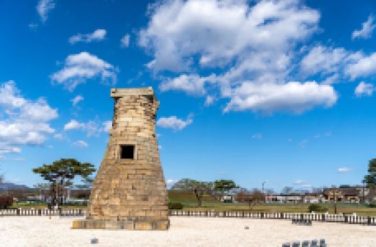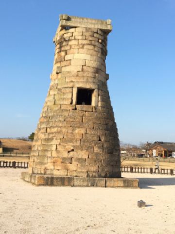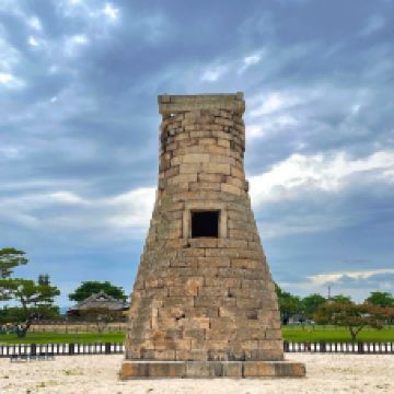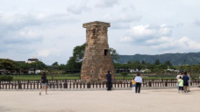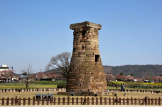瞻星台顾名思义就是古时候用来看星星的地方,建于新罗27代王善德女王时期,新罗时期主要作为天文观测台使用。整个瞻星台是由花岗岩所建,高9.17m,上端直径3.1m,下部直径5.17m,地基石座的单边边长为5.35m。双层地基石座与祭坛呈方形,大小分别是长台石的8倍和15倍。石座上则为27层的圆筒型塔身。整个瞻星台下宽上窄,竖直而立。瞻星台每层高度约为30cm,顶端为双层井字形石坛,据推测这里曾是某种观测仪的放置之处。上方是井字形状,而连接的部分却是酒桶状的圆体,因为常被误称为“摘星台”。