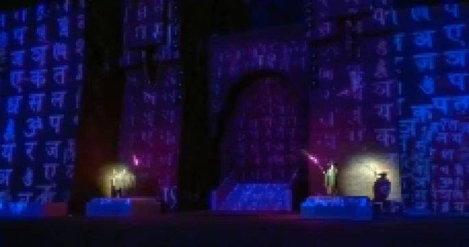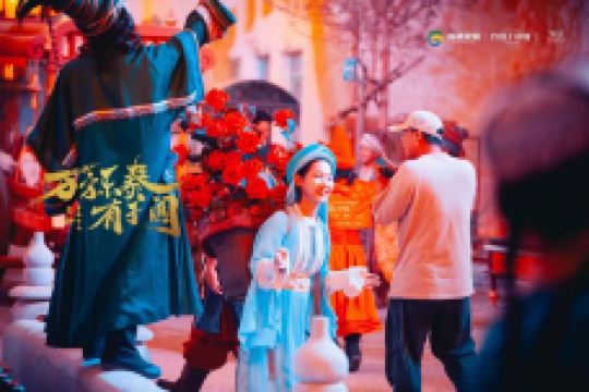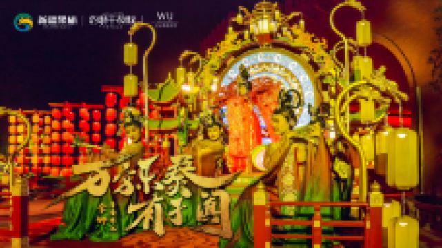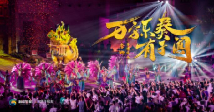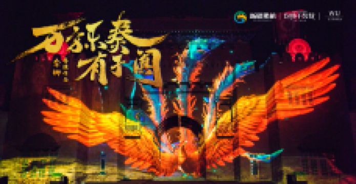凤鸣拂其羽,四海皆阳春”,震撼的光影秀以凤鸣为号,开城迎宾!瑞兽长鸣,金甲武士,护卫着尉迟王与尉迟后的马车仪仗,颁诏诚迎八方贵客。毗沙门轰然打开,迎宾舞阵热烈奔放,满眼奇幻,骆驼载乐俑花车蹁跹而来,迎来欢腾时刻。