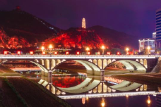 宝塔山下的延河桥,是一座继承和发展了我国古代敞肩式拱桥建筑传统技艺的石拱桥,有着浓郁的民族风格。全桥总长123米,3孔净跨各30米,主拱采用立墙空腹拱的形式,即在每个大跨上设有6个小拱,桥身轻秀,承载力强。宝塔山和延河桥,相谐相辉,已经是延安革命圣地的象征,是城市的标志,更是摄影、绘画的重要景点。在建桥过程中延安人民发扬艰苦奋斗的光荣传统,根据延河不需要通航,河床上又是砂质土壤的特点,采用“土牛拱胎”的施工方法,即在河床上用土堆成拱形,作为砌筑拱圈的胎模,这就大大降低了工程造价。延河大桥建成后,其建筑艺术受到了各方面的好评,资深的桥梁文化研究专家王展意著文赞扬说:“延河大桥选址得当,布局合理,造型美观,工艺精湛,与附近的青山绿水、宝塔古城,联芳济美,相映成趣。”如今,在延河的河床上砌上了石块,岸上筑起了水泥护栏和灯柱,柱上是乳白色的圆形电灯,入夜后两岸成为了一条明亮的灯线。在雄伟的宝塔上与壮观的延河大桥上灯饰斑斓,几乎为辉煌的透明体,相互映照之下格外瑰丽迷人。