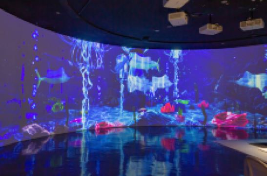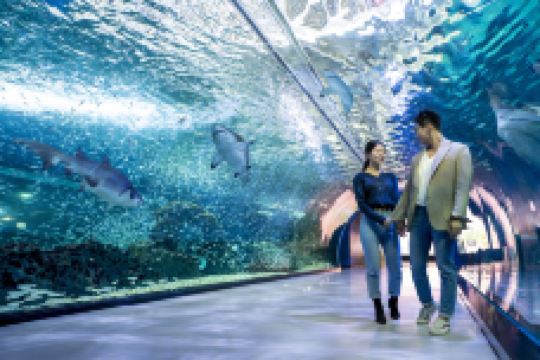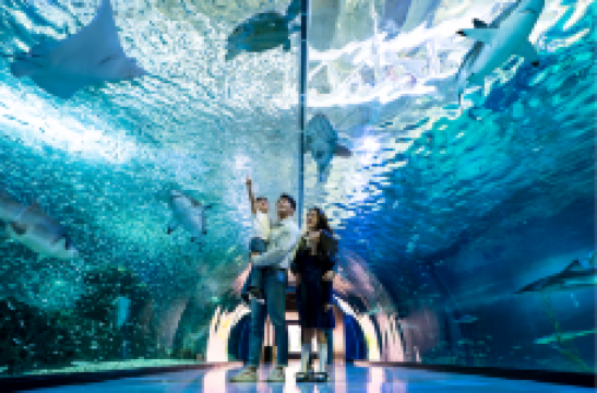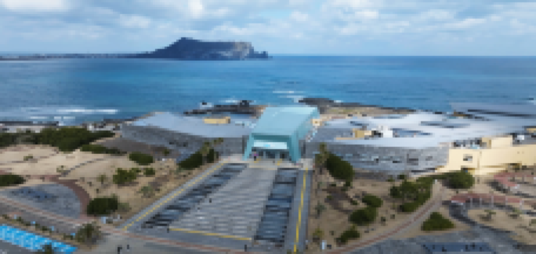 济州岛Aqua Planet水族馆占地25,600平方米,由四大区域组成:水族馆、海洋舞台、海洋科学馆和中央表演厅。水族馆总容量达10,800吨,位列世界十大水族馆之一。馆内共展出48,000只生物,包括鲸鲨、六条海豚、巨型鲨鱼和10,000条红鲷鱼。