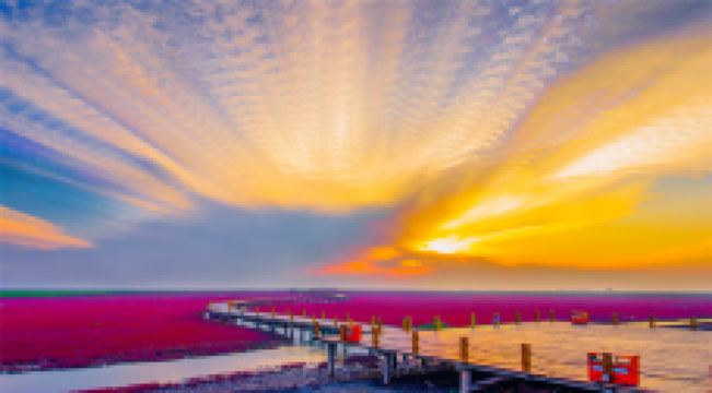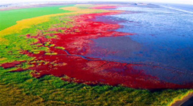 秋天,火红的碱蓬,金黄的水稻,绿色的芦苇,蓝色的大海,黑色的滩涂构成了一幅五彩斑斓的油画,吸引人们把目光投向这彩色的王国。