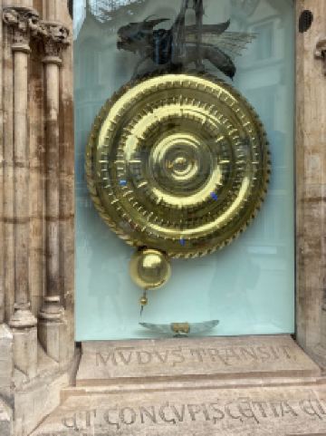 圣体钟的钟面是24克拉镀金不锈钢圆盘,直径约1.5米(4.9英尺)。它没有指针和数字,而是通过蓝色发光二极管显示时间。时钟的主要视觉特征是一个类似蚱蜢或蝗虫的昆虫金属雕塑,时间仿佛被这只怪物不断的吞噬。时钟下面铭文为拉丁文的约翰一书2章17节: mundus transit et concupiscentia eius。作为公共艺术作品,它以一种戏剧性的方式提醒观众:时间必然流逝。