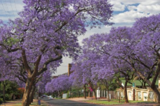 世界上有至少49种蓝花楹,其中大部分原产于南美和加勒比海地区。蓝花楹隧道位于比勒陀利亚,比勒陀利亚栽种着7万多棵蓝花楹,也被称之为“蓝花楹之城”。花儿朵朵开时,蓝花楹为这座美丽的城市画上一笔迷人的紫蓝色,让人流连忘返。