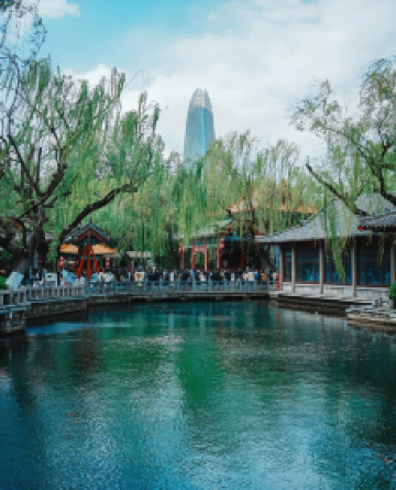 天下第一泉风景区位于济南市中心,由“一河(护城河)一湖(大明湖)三泉(趵突泉、黑虎泉、五龙潭三大泉群)四园(趵突泉公园、环城公园、五龙潭公园、大明湖公园)”组成。