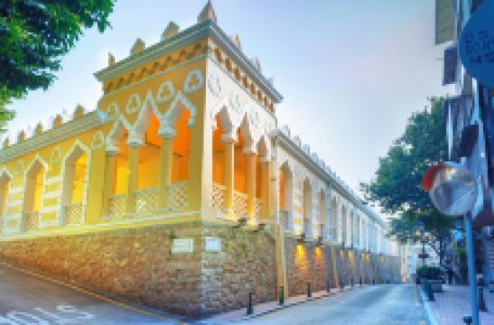 港务局大楼,原称摩尔兵营,后改为船政厅和水师巡捕所(今天的港务局)的办公地点,因此俗称水师厂。黄白主色调的欧式建筑,整齐而充满韵律感,长长的阿拉伯风格回廊,相当美丽。港务局大楼建在一处由花岗石围筑而成的平台上,建筑物除了中央局部为二层高约6.6米外,其他地方都为一层式设计。建筑整体粉刷成黄色,并以白色花纹衬托,它与粗糙的花岗石墙基在色彩及质感上均形成强烈的对比。除了近妈阁山一侧外,建筑物三周均有宽约4米,带有伊斯兰式尖拱券的回廊环绕,各尖拱间以三叶饰点缀,加上女儿墙上有节奏雉堞式排列的方尖形装饰,形成一种强烈的韵律感。