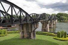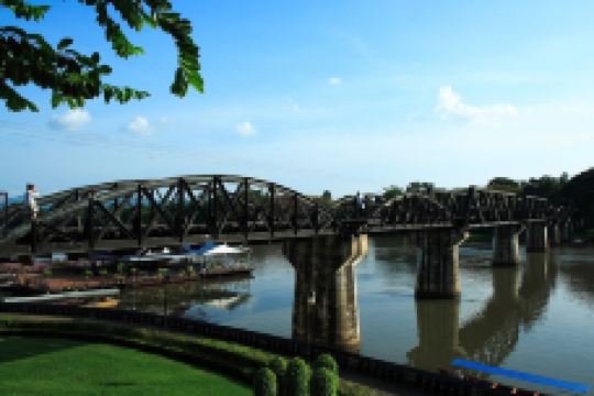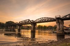 在曼谷西北122公里的北碧府(Kan-chanaburi),这座横跨桂河的大桥———桂河大桥,折射了二战期间的一段历史:当年日军占领泰境期间,强迫盟军战俘建造铁路连接缅甸及暹罗,这条铁路在牺牲了无数宝贵性命后才得以完成,故有“死亡铁路”之称。桂河大桥就是其中的一段,被称为“死亡铁路”的咽喉。大桥的一边地势较为平缓,但一过河便是险峻的群峰,有的路段甚至就开凿在悬崖绝壁之上。