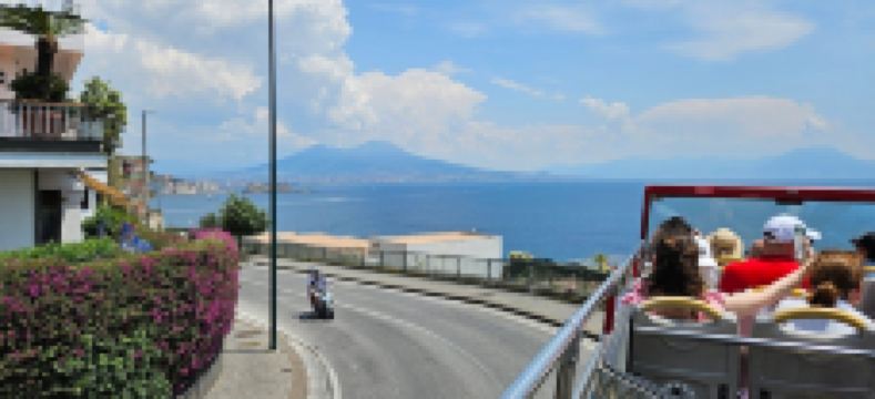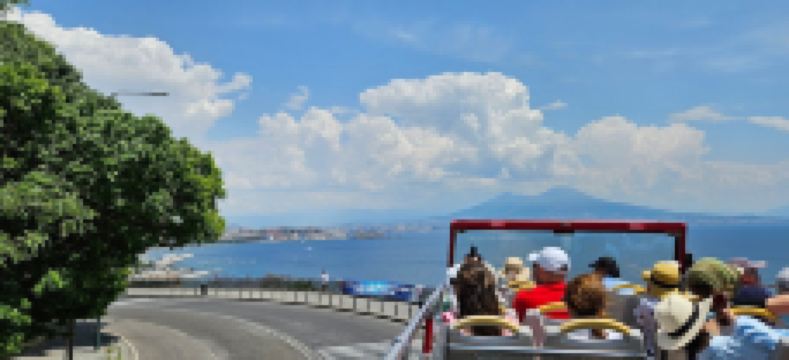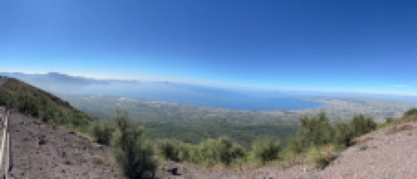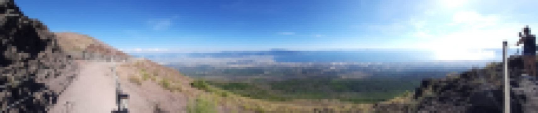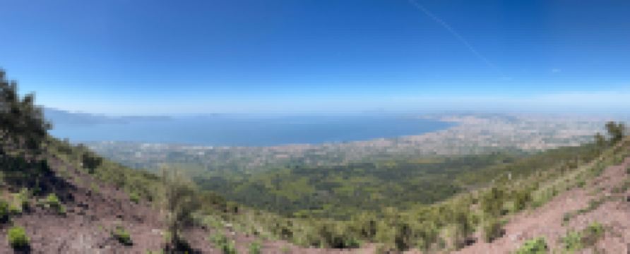 从庞贝到维苏威火山有专门的大巴,行程约一个小时,庞贝火车站门口就有去维苏威火山的售票处,发车点也在火车站门口。大巴的班次不是很多,一般正点发一趟车。汽车穿过维苏威国家森林公园后,停在半山腰,还要换乘专门用来爬坡的车子,之后再换徒步,沿手扶栏杆攀登至火山口。