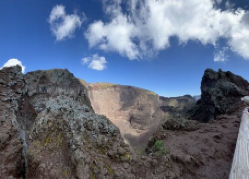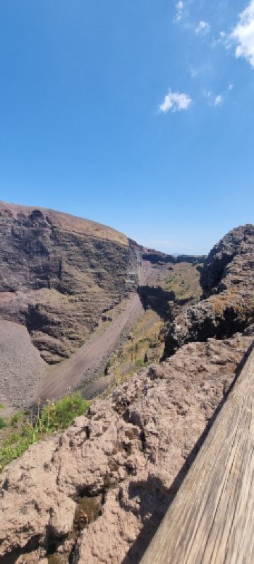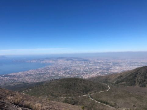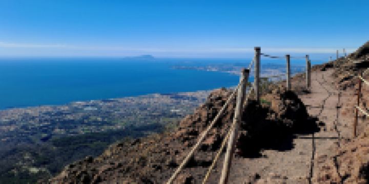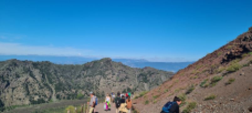 你可以徒步攀登维苏威火山,沿着火山石的坡道抵达火山口,大约20-30分钟就可以上到顶去看火山口。因为海拔较高,山口的风速较大,登顶时需要手扶栏杆前行。