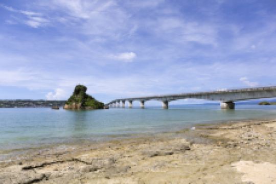 古宇利大桥跨越美丽湛蓝的海洋,长约2公里,连接着屋我地岛及拥有冲绳版亚当与夏娃(Uminai与Umiki)神话传说的古宇利岛,是冲绳县内连接离岛长度第二的大桥。