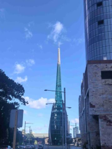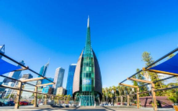 天鹅钟塔位于美丽的天鹅河畔,又叫珀斯钟塔,是珀斯的地标性建筑。这座带有玻璃尖顶的天鹅钟塔高82公尺,晚上塔身会变换不同的颜色,现已成为各地游客的理想旅游地。天鹅钟塔内存放着来自英国各地的18个大钟,组成一组,随着人员的击钟演奏而奏出不同的音乐,游客也可以亲身体验敲钟。这组钟也是当今世界上较大的一组铜钟之一,也是英格兰以外的皇家钟楼。天鹅钟塔顶层还有26个小铜钟,游客可以投币并通过电子菜单选择想要听的曲目。天气好时,游客还可以上到天鹅钟塔六楼的户外平台上欣赏珀斯市区和天鹅河的美景。