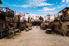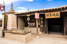 敦煌影视古城又称敦煌影视城、敦煌古城,位于敦煌市区西南侧,距离市区车程约16公里,是游客游玩敦煌西线上的一处重要景点,一般和玉门关、阳关景区、敦煌雅丹国家地质公园一起一日游玩。影视古城是1987年中日合拍历史故事片《敦煌》时仿造宋朝沙州古城建设,后来又成为《封神演义》、《新龙门客栈》、《奔跑吧兄弟》等众多影视剧和综艺节目的取景地。游客可以来此欣赏西北风情的古式建筑、街道,拍摄古风的照片,也可以细心寻找,发现众多节目中熟悉的场景。敦煌古城的面积不大,长宽大约都有几百米,进入后步行游览即可。一般步行走一圈下来大约1小时即可走完,而且这里并不像其他古城那样有很多店铺可逛,主要都是用来拍影视剧的屋舍,游玩内容比较单调,所以很多游客来此会比较失望。但是如果细心观察,敦煌古城也有很多值得注意的特色。首先便是古城内街道的建筑特色,敦煌古城目前主要有敦煌街、高昌街、甘州街、兴庆街、汴梁街五条街道,每条街道的建筑风格都代表一个地区,走在其中便可寻找地域穿梭的神奇感觉。敦煌街是参考了莫高窟中西部古城的壁画建造的,也是古城内繁华的街道,在这里可以看到纯正的敦煌古老街道的样子。高昌街则是仿造新疆吐鲁番的古建筑风格,可以看到很多维吾尔族风情的土坯方形房子,极具新疆特色。甘州街是模仿古甘州城(即现在的张掖),可以看到街上很多的茶棚等,体会河西走廊上绿洲驿站的特色。兴庆街的兴庆则是代表着银川,这里以西夏风情的建筑为主。后一条汴梁街是仿造宋朝时汴梁的街道设计,也是古城内一座中原风情的街道。五条街道各不相同,逛起来非常有特色。体会几条街道不同风情的同时,也要留心观察一下几处特别的建筑,这些建筑是古城里的亮点,也是很多影视作品中都会出境的场地。例如敦煌街中心处的刺史府便是古城内气派的建筑,也是《跑男》中“老爷审犯人”的场所;九里香是反映酒泉地区酒文化的主要建筑;鸿运客栈则是《张大千——敦煌传奇》中张大千临摹壁画时的居住地,等等。在这些建筑中漫步参观,寻找电视电影中熟悉的场景,也十分有趣。