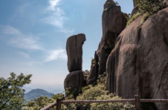 地藏靴位于宝塔峰南侧,有一石形似长筒靴倒置在悬崖顶上,俗称”仙人晒靴石”,传说是地藏穿过的一只僧靴所化,故名。另一只在聚玉峰东侧,东西相对,正好一双。