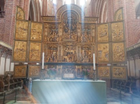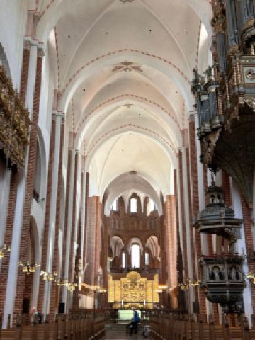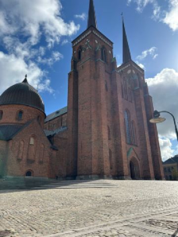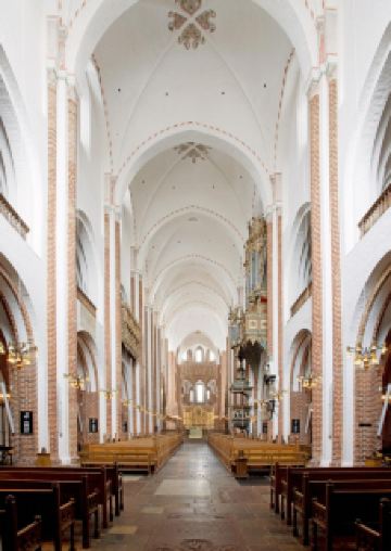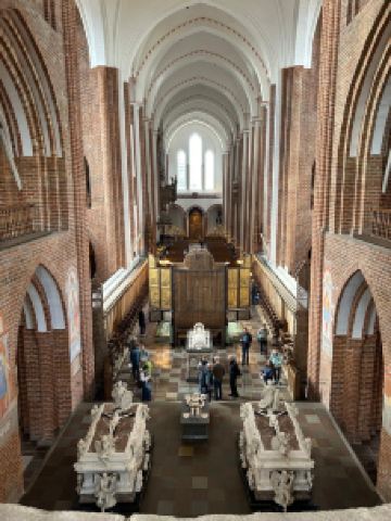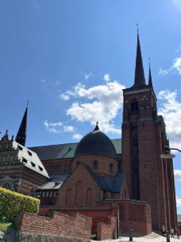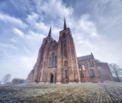 罗斯基勒大教堂是丹麦较为杰出的建筑精品之一,是丹麦的一座红砖哥特式教堂,建于12-13世纪。几个世纪以来,很多罗斯基勒的中世纪建筑都已毁于大火,但这座庄严的大教堂依然矗立至今。 教堂结合了哥特式和罗马式建筑风格,两座尖塔气势宏伟,是丹麦千年来教堂建筑风格的范例,已被列入世界遗产名录。