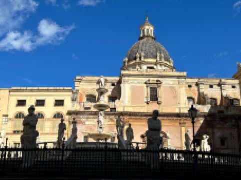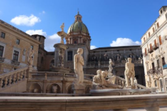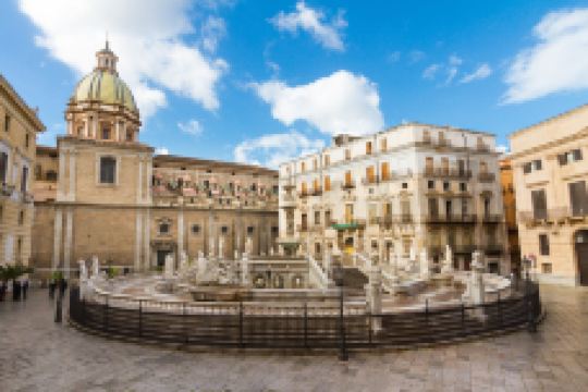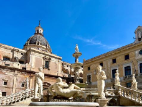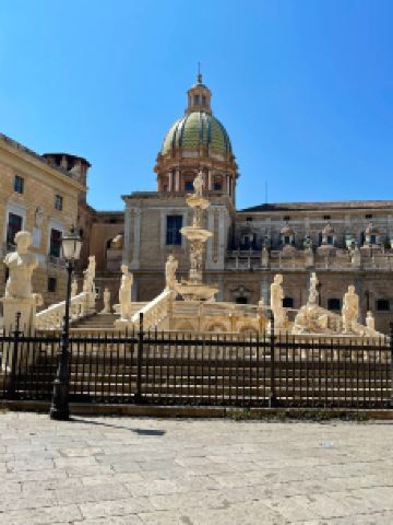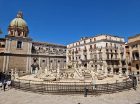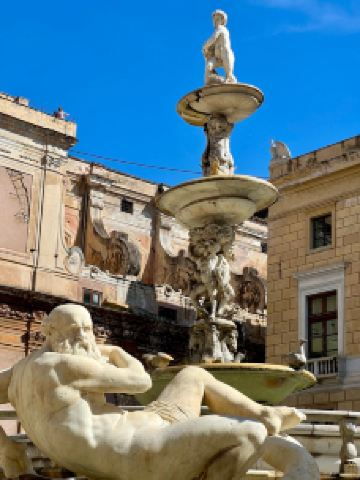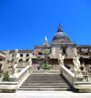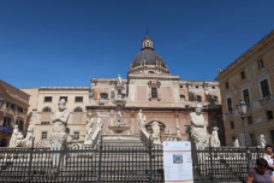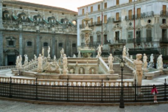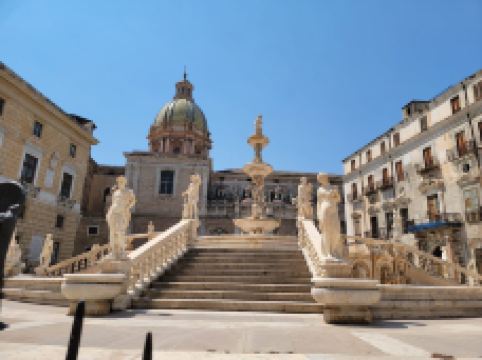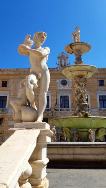 普雷托利亚喷泉由4座桥梁、楼梯围绕,四周雕刻奥林匹亚众神。这座喷泉也被称为“羞耻之泉”,是因为喷泉四周表情暧昧的裸体雕像让保守的西西里教民难以接受,不过现在这座喷泉成为小镇有名的景点之一。