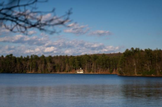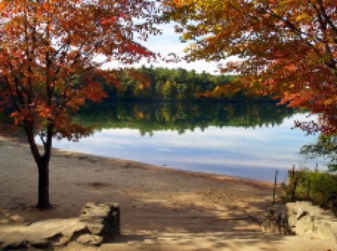 瓦尔登湖成名于美国哲学家作家亨利•大卫•梭罗所写的《瓦尔登湖》一书,梭罗在湖畔建造了一个小木屋,严格控制自己的日常用品和与他人的联系。然后他在此生活了两年零两个月又两天的时间,完成了这篇巨作。许多人慕名而来参观这里,湖水真的如作家所言泛着淡淡的蓝色,冬天时结了厚厚的冰。湖畔修建了供观光的栈道,周围十分安静,恍若世外桃源。