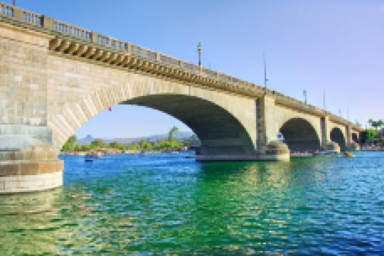 伦敦桥原来是伦敦泰晤士河上的一条交通要道,建于1820年。到了60年代,伦敦桥因为跟不上交通需要被当局决定拆除。而这座拥有150年历史的旧桥被精明的英国人拿出来拍卖后,被美国麦库洛奇地产公司老板麦克洛克以246万美元拍下。于1968年,用海轮将拆开的石块远渡重洋,运到哈瓦苏湖城,将桥再现于一条人工河道上。今天,古老的伦敦桥落户异邦荒漠中的这块绿洲,与周围的景色相映衬,显出独特的异域风光来。