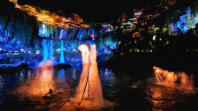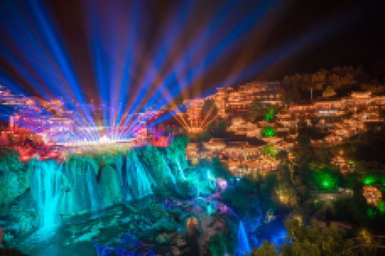 这里家家都有南瓜灯,夜幕降临,华灯初上,加上打着彩光的瀑布,夜景十分炫丽华美,如同天上的宫殿,令人陶醉。