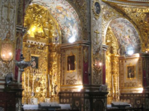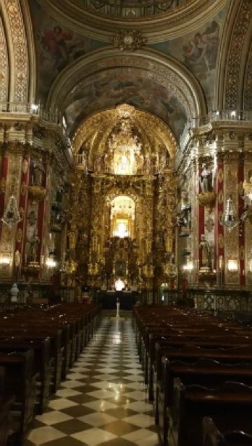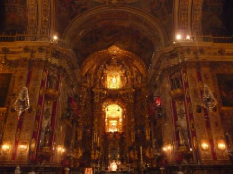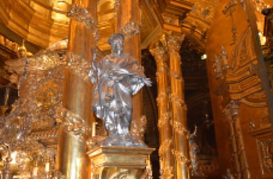 教堂内部装饰富丽堂皇,金色的祭坛和精致的雕刻令人叹为观止。游客可以欣赏到丰富的宗教艺术作品,包括绘画、雕塑和镶嵌艺术,这些作品展示了巴洛克时期的艺术风格和宗教信仰。