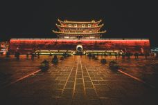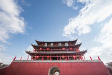 朝阳楼又称迎晖门,位于建水县中心建中路的东端,是建水古城的地标性建筑。唐元和年间,南诏政权在此处修筑土城,明洪武二十年(1387年),设临安卫,在原来土城的基础上扩建成砖城。明洪武二十二年(1389年)修建了朝阳楼,即当时建水城的东城门楼。清顺治初年,李定国攻占临安城,南门、西门、北门三座城楼毁于战火,康熙四年修复,后再度毁损,如今已坍塌消失了。唯有东门朝阳楼,虽历经多次战乱和地震,仍然屹立如初,成为滇南重镇留存的标志。朝阳楼高三层,为三重檐歇山顶结构,站在楼顶可以凭窗俯瞰临安路之众生相。朝阳楼和它旁边的半月形广场是当地人的休闲场所。清晨阳光渐上城楼和夜晚大放异彩的朝阳楼是摄影爱好者喜欢的景致。