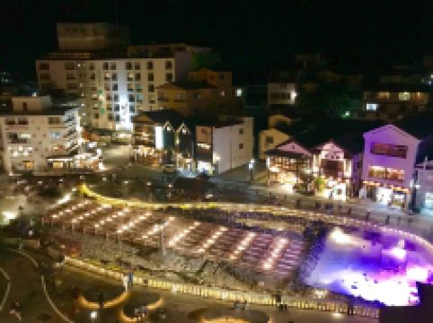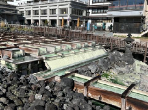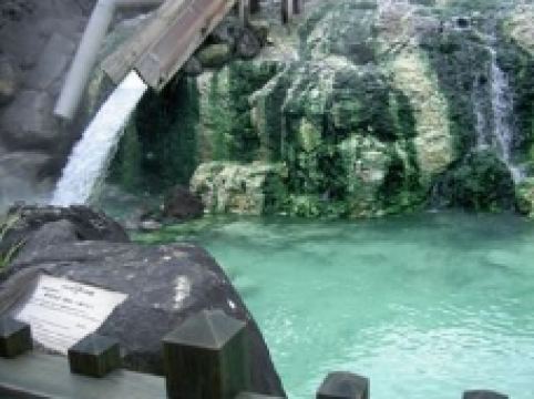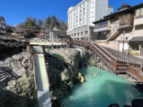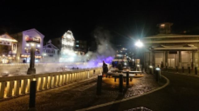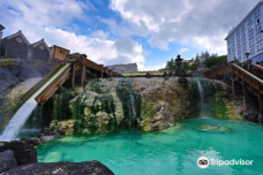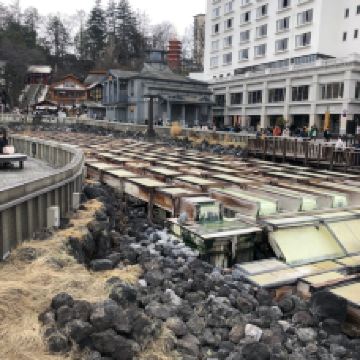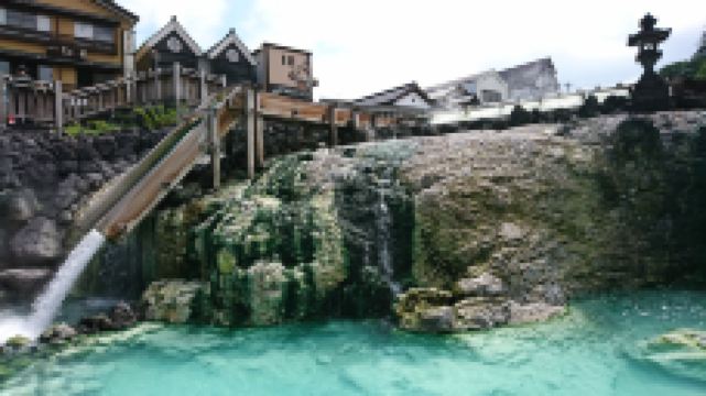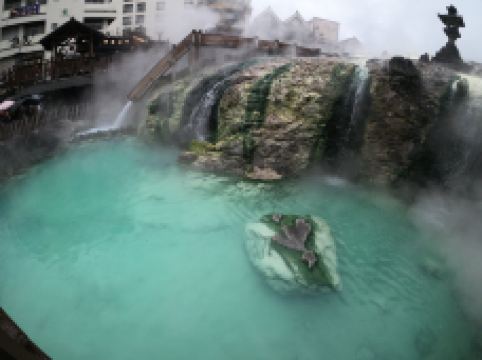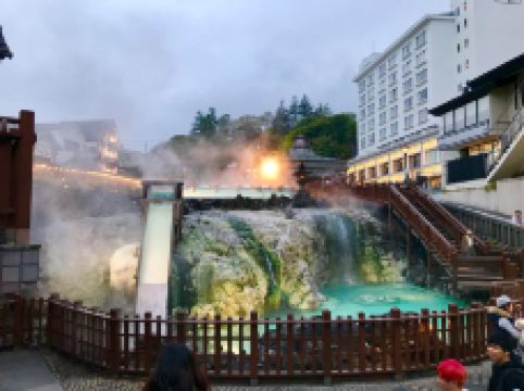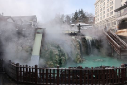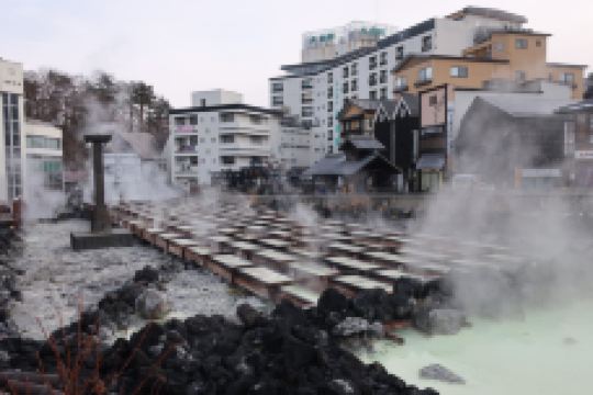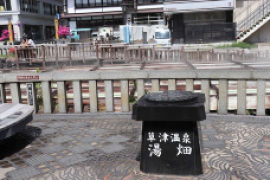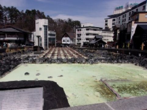 汤畑是草津温泉的地标。汤畑处在草津温泉的中心地带,是一处被圈围起来的温泉源头,面积约是一个足球场的大小,到处都冒着阵阵白烟,依稀可以闻到硫磺的味道。
