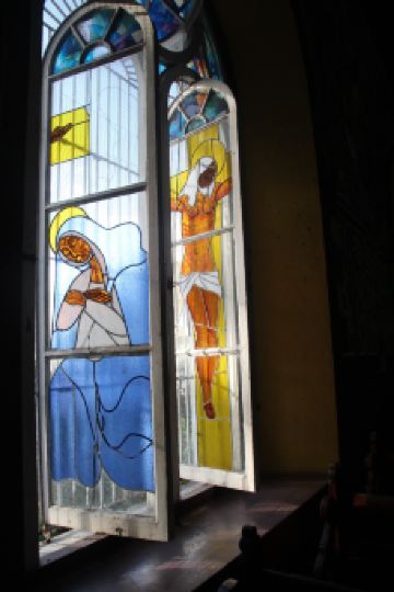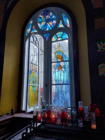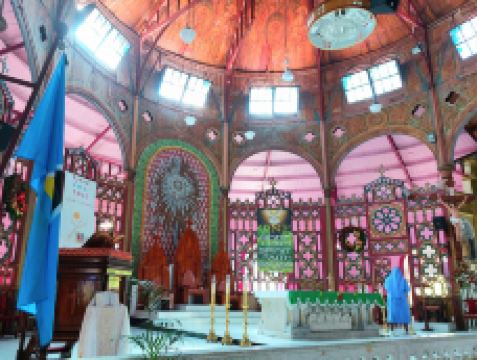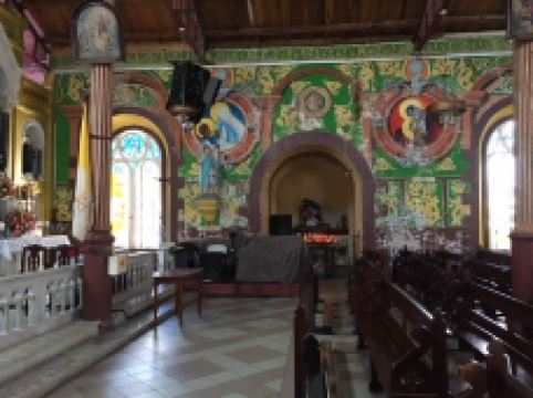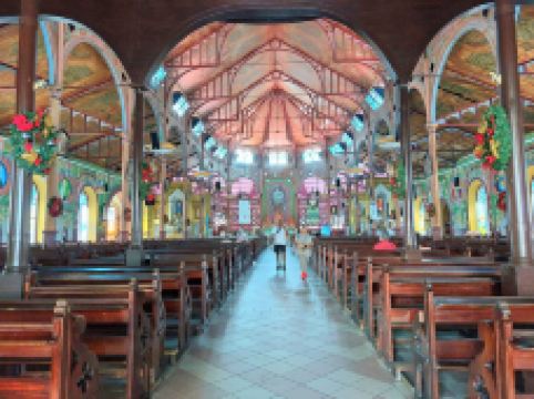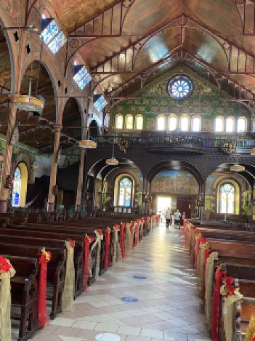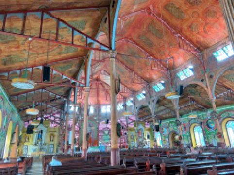 这是一座宏伟的老教堂,教堂拥有独特的木制天花板和彩色玻璃窗,内部的墙壁上还装饰有色彩斑斓的壁画,优雅又大气。