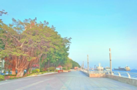 该路段景色秀美宜人,交通便捷。隔海,可以遥望对面的汕头知名景点——礐石风景区。隔路,是人民广场、体育馆、汕头迎宾馆、市政府、科技大厦等大型建筑。可以到人民广场上看大型雕塑——一群欢快的儿童抬着一个大海螺向海滨走去。