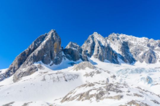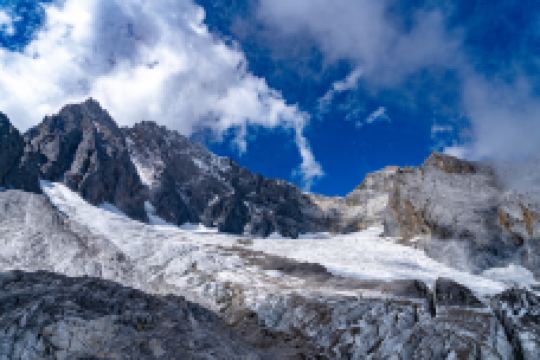 扇子陡是玉龙雪山的主峰,海拔5596米。由丽江平原中看扇子陡,像是一座竖立起来的银铧。攀登上雪山来看它,像一把白绫折扇展开在那里,所以有扇子陡和雪斗峰之称。现在由锦乡谷的草坪中仰望上去,又像一片白玉壳,三面作放射状指向天空,在碧天白云中闪闪发光,是玉龙雪山的标志。