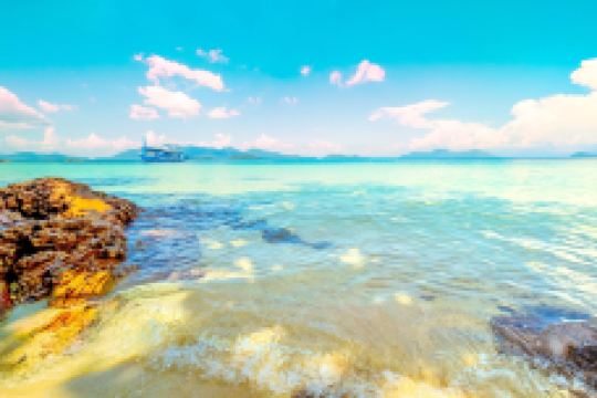 涠岛是四岛游中的一个岛,沙滩很浅,一直延伸到海底。这里的海水未被污染,清澈见底,是浮潜的绝佳场所,并且不同海域各有特色:有的坐拥瑰丽多饶的珊瑚礁,有的是五彩斑斓鱼儿的栖息地,还有同一区域的海水,由于不同海洋生物的映衬呈现出不同颜色。